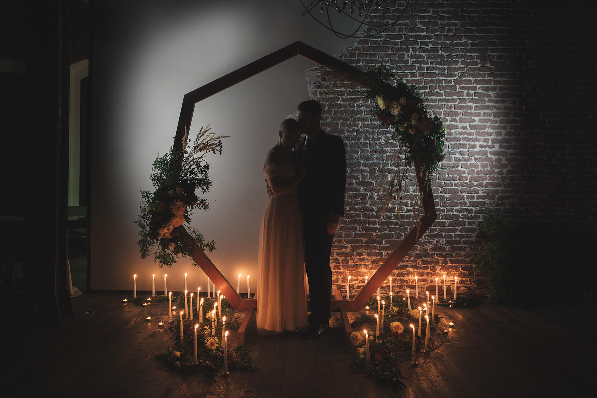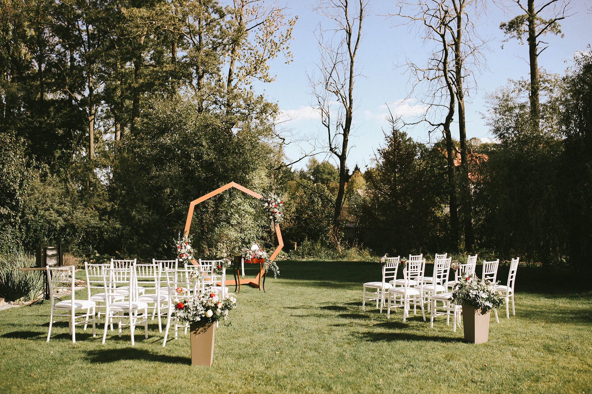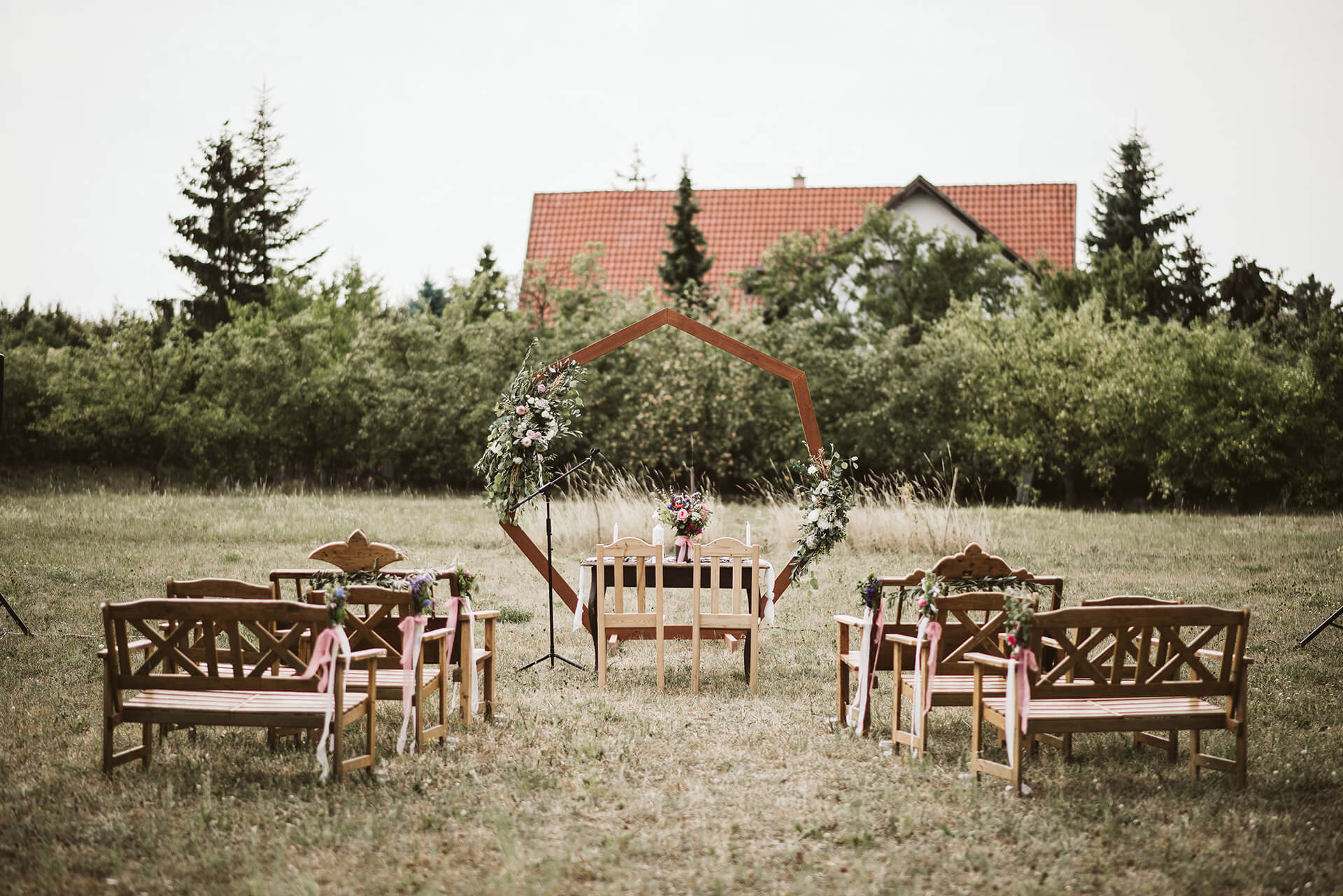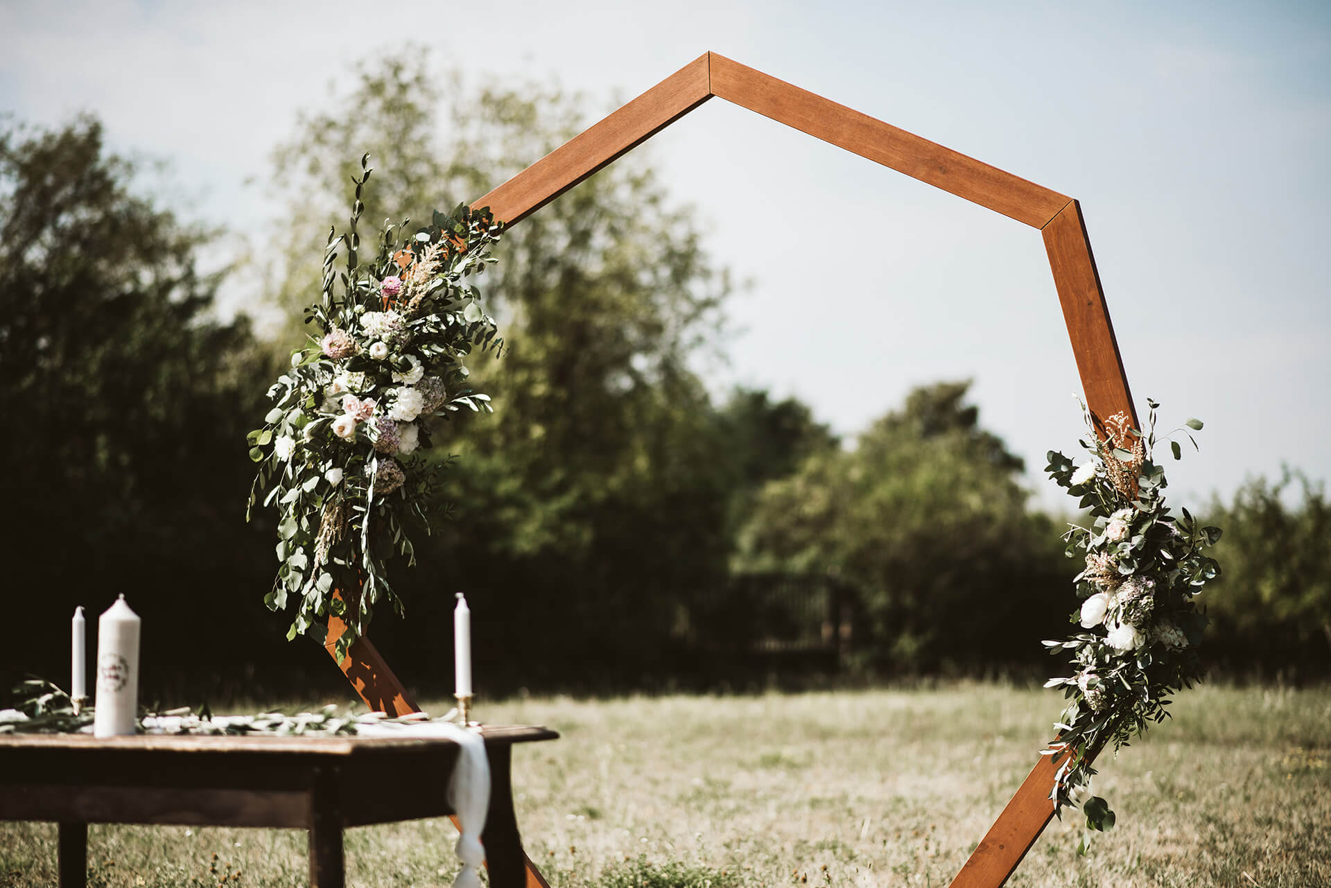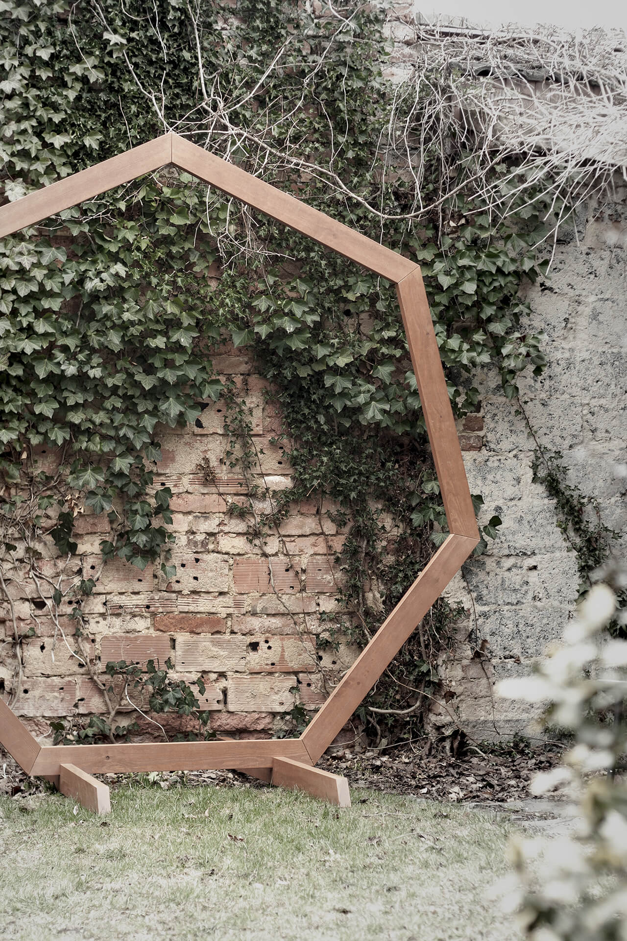 Originální dřevěná slavobrána geometrického tvaru ve středně hnědé barvě, která se perfektně hodí jak do interiéru, tak pro všechny svatby v přírodě. Rozebíratelná konstrukce skládající se ze 7 částí a 2 nohou.